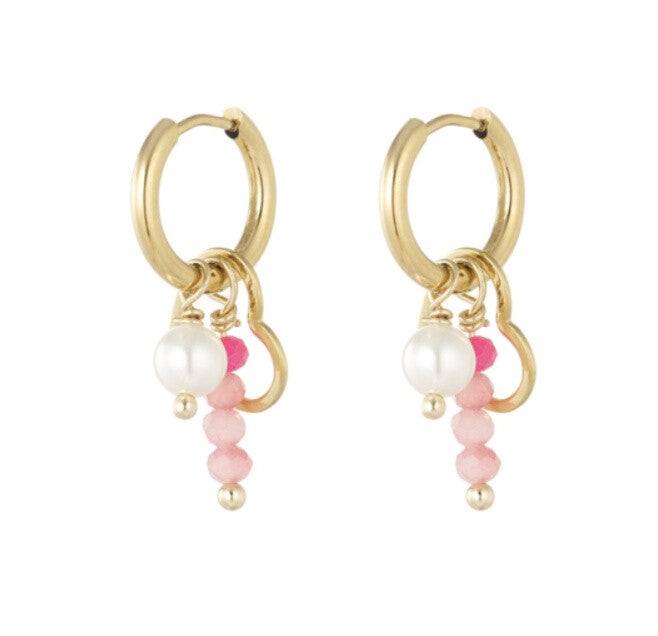 Deze oorringen vallen op door de verschillende bedeltjes: een open hartje, een parel en roze natuursteentjes. Het hartje maakt ze extra liefdevol en daarom ook perfect om cadeau te geven aan iemand die je liefhebt.