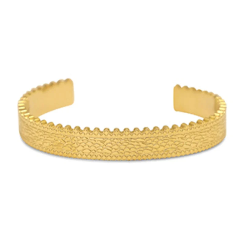 Deze goudkleurige bangle armband heeft een krachtig en elegant design met een verfijnde structuur. De subtiele textuur geeft het oppervlak diepte en zorgt voor een luxe uitstraling zonder te overdrijven.