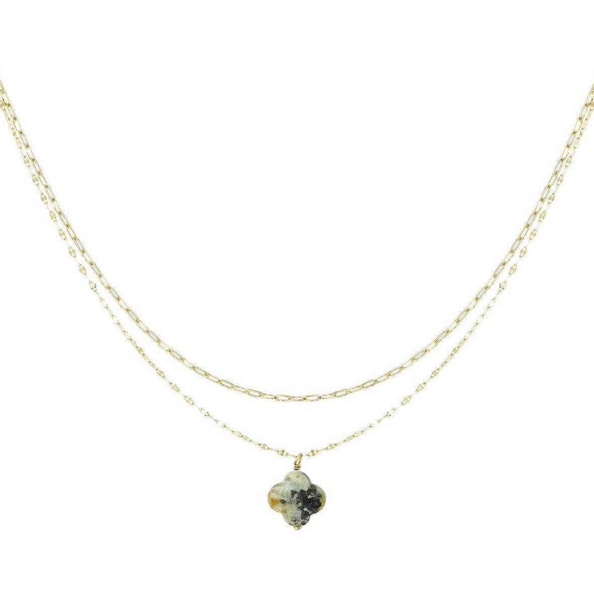 Soms zit het geluk in een klein detail. Deze verfijnde tweelaagse ketting met een klaver van natuursteen draagt daar op een zachte manier aan bij. De groene hanger staat symbool voor hoop en vertrouwen – iets om dicht bij je te dragen, elke dag opnieuw.